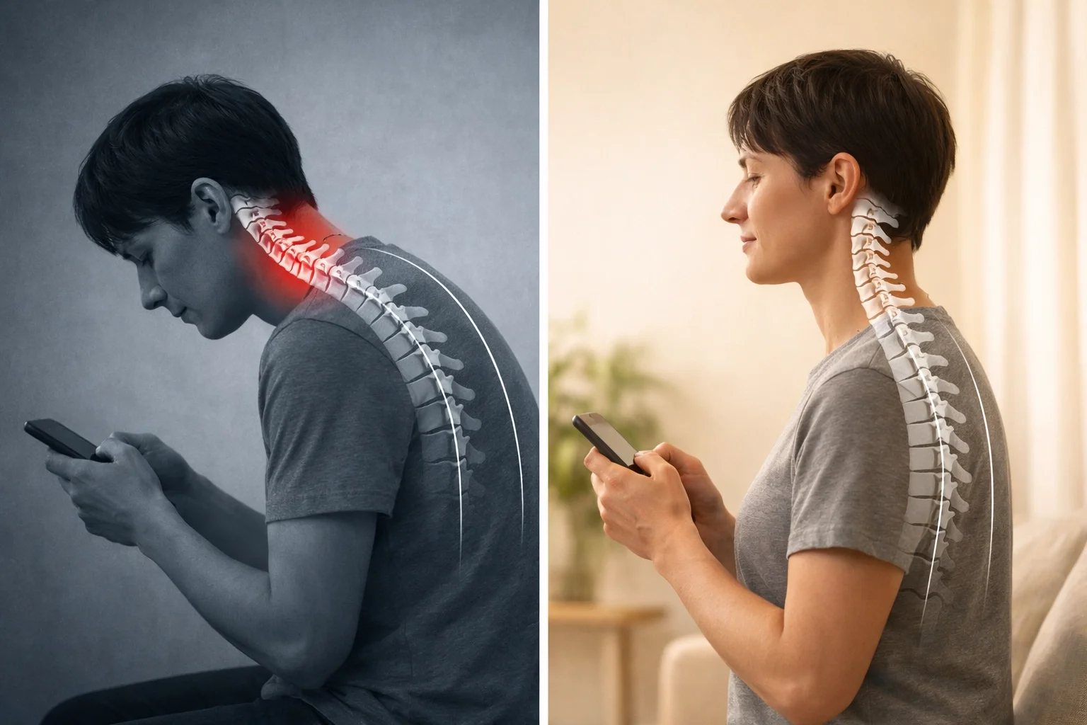 We can't adjust your spine and send you back to eight hours of forward head posture every day. Be mindful of your desk setup, phone habits, and daily positioning.