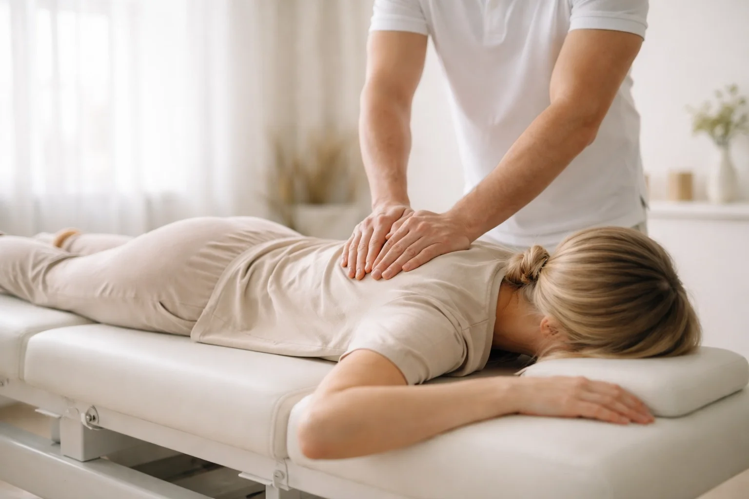 Picture of a woman on a massage bench with off white clothing and two hands resting on the upper back