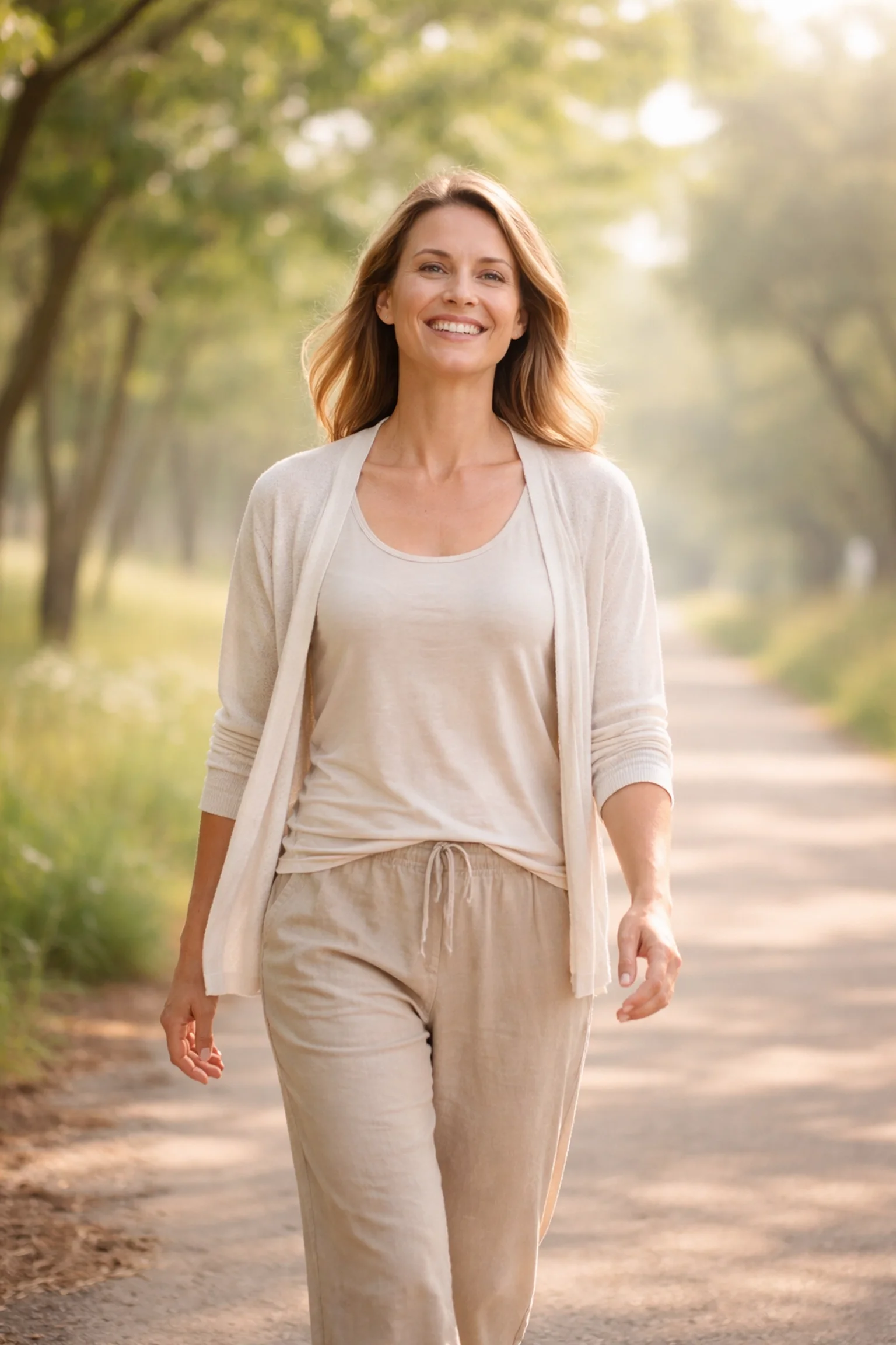 A happy healthy women walking in nature and smiling.